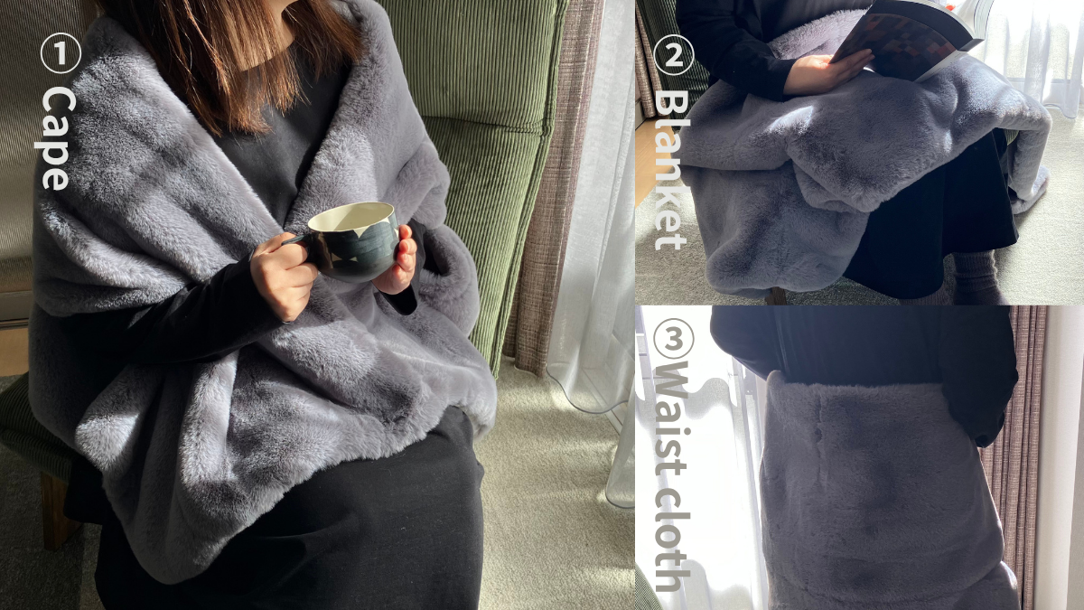 形状が長方形(50×175cm)なので、ケープとして羽織るのはもちろん、ひざ掛けとしても腰に巻いて巻きスカートのようにも使うことができます。