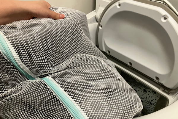 洗濯ネット使用で洗濯機で洗えるのは嬉しいです。弱水流のおしゃれ着洗いコースにしてスイッチオン。