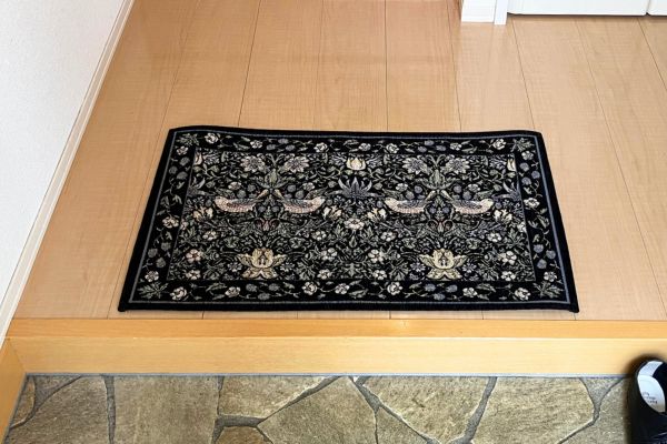 モリスのデザインは好きなのですが、床はナチュラル系ですっきりした印象の玄関である我が家では、 「ザ・モリス」感が出てしまうと違和感があるかも…?と思っていたのですが、モノトーン調の効果もあってか主張しすぎずちょうどいい存在感でした。