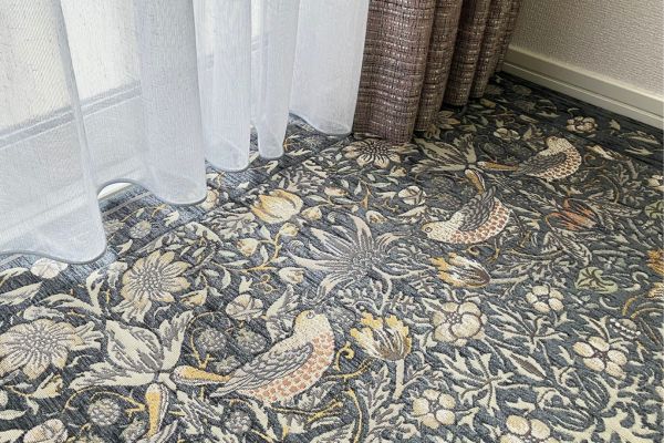 木製家具やグレー系の床、モダン・シンプルなインテリアとも相性が良く、「柄物だけど主張しすぎない」バランス感が魅力です。
