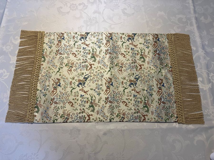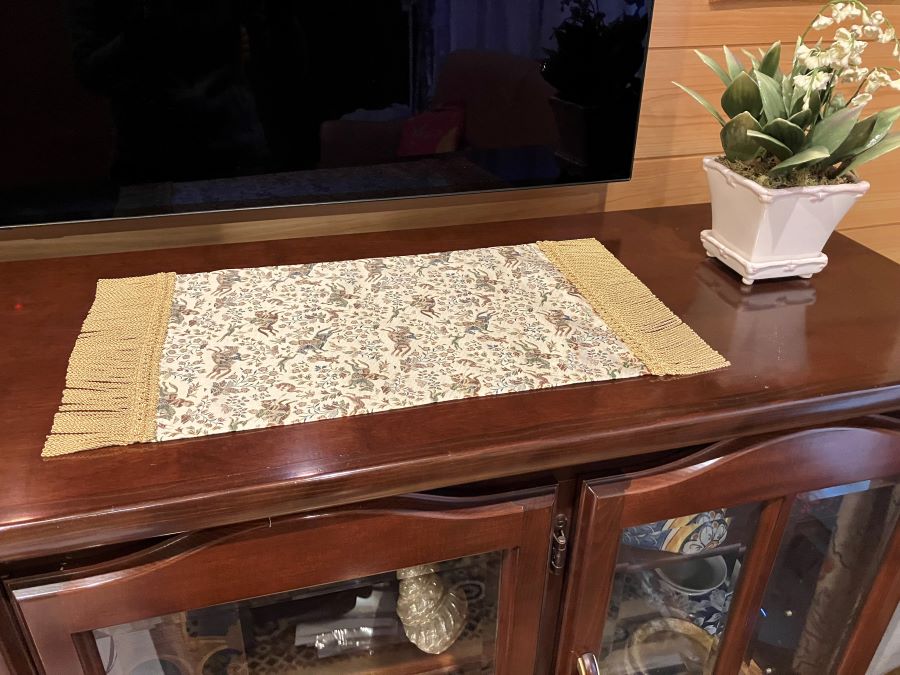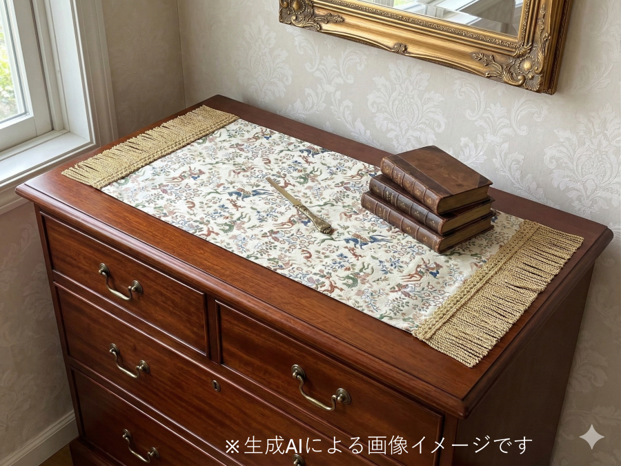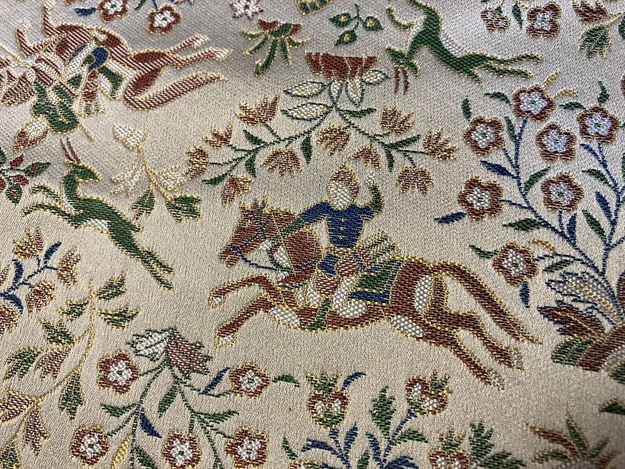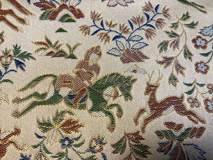 こんにちはスタッフOです。 今回ご紹介するのは、重宝裂(ちょほうぎれ)のテーブルセンターです。 重宝裂(ちょほうぎれ)は、日本の伝統的な織物技術を受け継ぎながら、現代の感性を取り入れて織り上げられた美術工芸織物です。 川島織物セルコンでは重宝裂のテーブルセンターを数多くそろえています。今回ご紹介するのは『狩猟紋錦(しゅりょうもんにしき)』です。