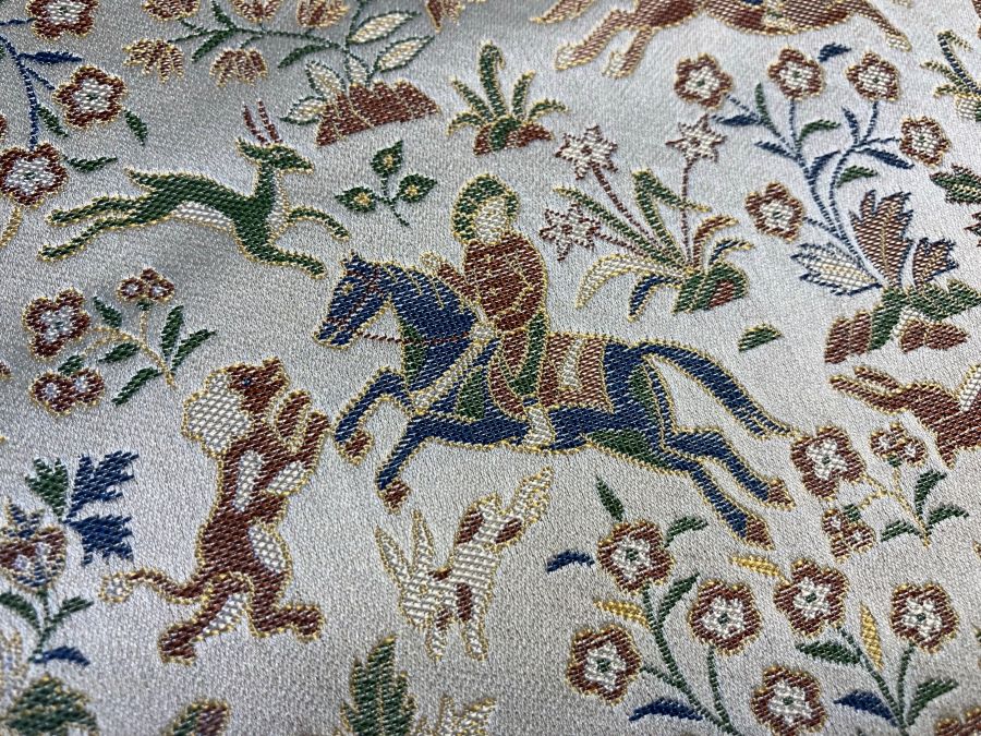 16世紀は、ペルシャ染織がもっとも華やかに発展した「黄金期」といわれています。 この重宝裂は、その時代の織物をもとにしたもので、草花の模様の間に、馬に乗って狩りをする貴族たちの姿がいきいきと描かれています。