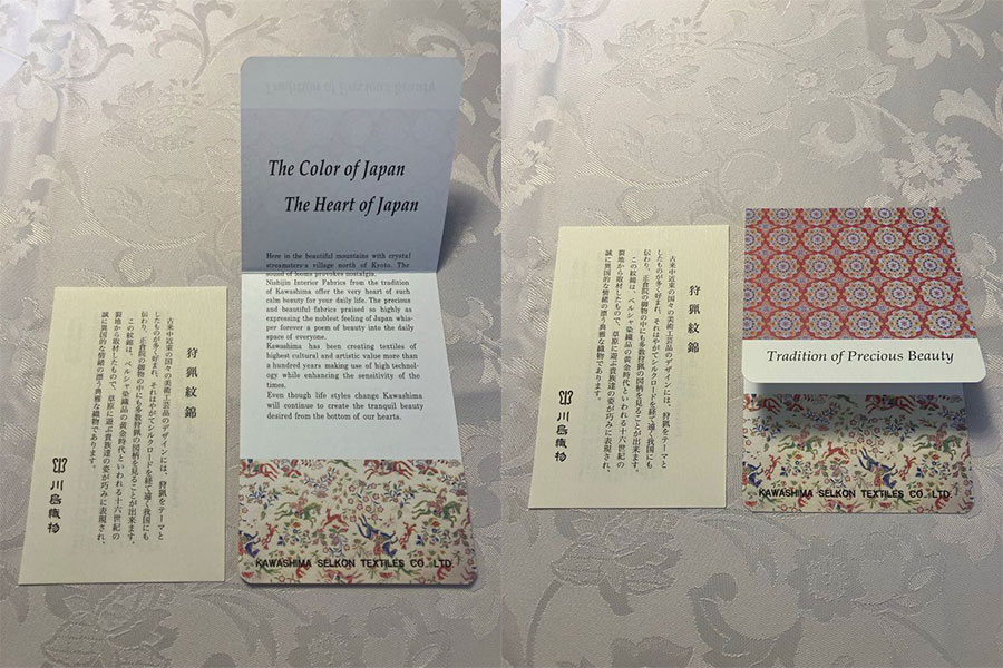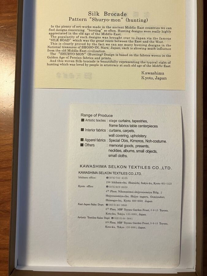 日本の伝統工芸の中に感じられる異国情緒が好きで、今回はこちらを選びました。当社では 祇園祭の祭礼幕の修復を手掛けており、以前見に行ったことがあります。 豪華絢爛な祭礼幕のデザインには、異国情緒があふれているものが多く、華やかさにとても魅了されました。今回ご紹介している狩猟紋錦との共通点を感じます。
