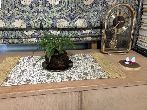 桐ダンスの上に置いてみました。コケ玉の緑ともよく調和します。なお、シルク製のためご自宅でのお洗濯はできません。植物を飾る際は、水濡れに十分ご注意ください。