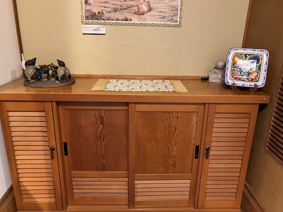 リビングの飾り棚に置いてみました。色の濃い家具に置くとシルクの光沢が美しく映えます。