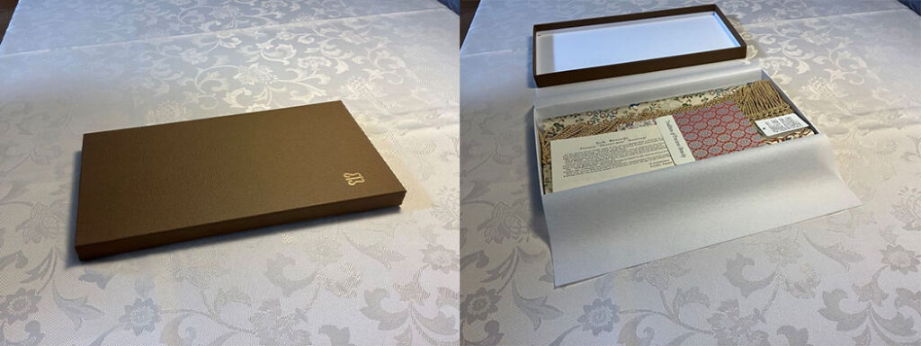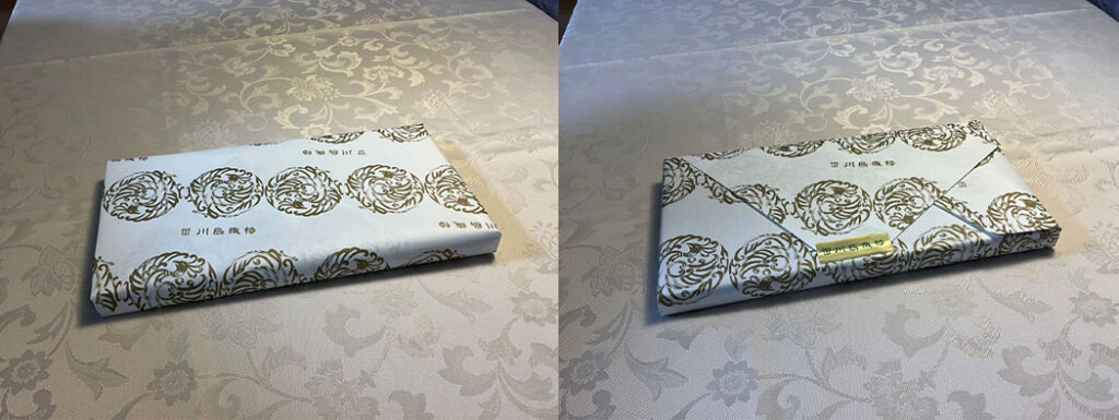 軽くて持ち運びやすいので、海外旅行などのお土産にもぴったりです。上品な日本土産としてご好評いただいております。ギフトラッピングを一緒にご購入いただくと、包装紙をお付けできます。慶事用・弔事用からお選びいただけます。今回は慶事用にしました。さらに、オプションで熨斗(のし)もご指定いただければお付けすることができます。