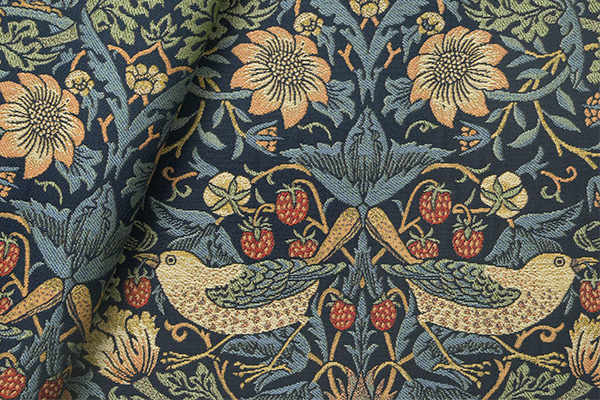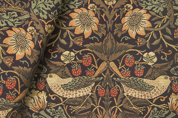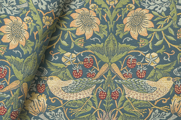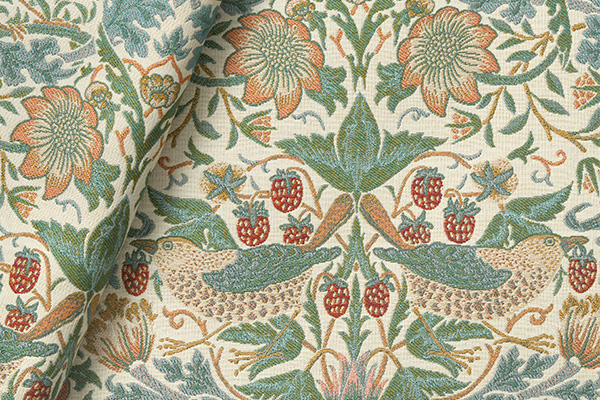 時代を超えて愛されるウイリアム・モリスの代表作の一つで、モリスの別荘である「ケルムスコット・マナー」でいちごをついばむツグミを見て描いたデザインです。 1882~1885年にモリス商会のマートンアビー工房で製作されていたハンドプリントを織物にしました。