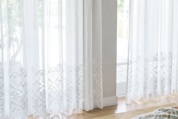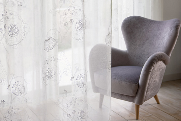 よりエレガントな印象にしたい場合は上品な房付き装飾タッセル、レースには様々な花の刺繍が美しいマリーイザベルを合わせていただくと、 カーテンを開けた時も華やかな空間となり、一日を通してお楽しみいただけます。