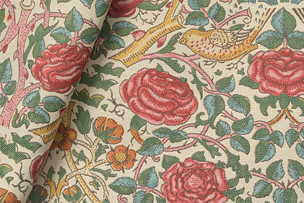 チューリップとバラの花が華やかに咲き誇り、茂みの中では陽気な2羽の鳥が戯れる、優雅で生き生きとしたデザインです。 この柄は1883年、ウィリアム・モリスによって家具用ファブリックとして製作され、彼の親友であるエメリー・ウォーカー卿の居間にも用いられていました。