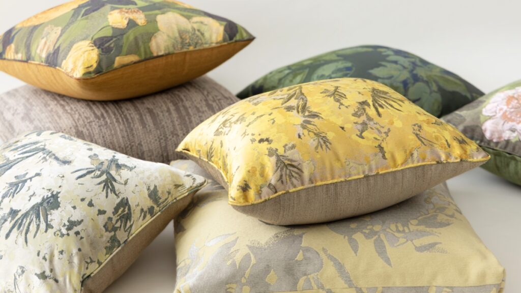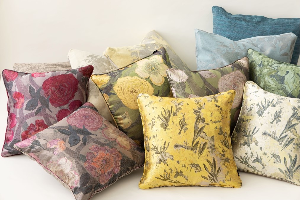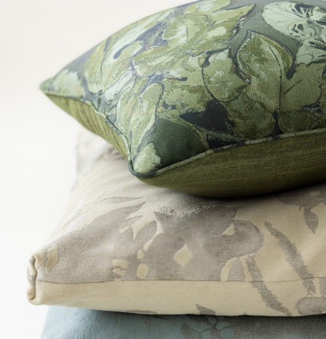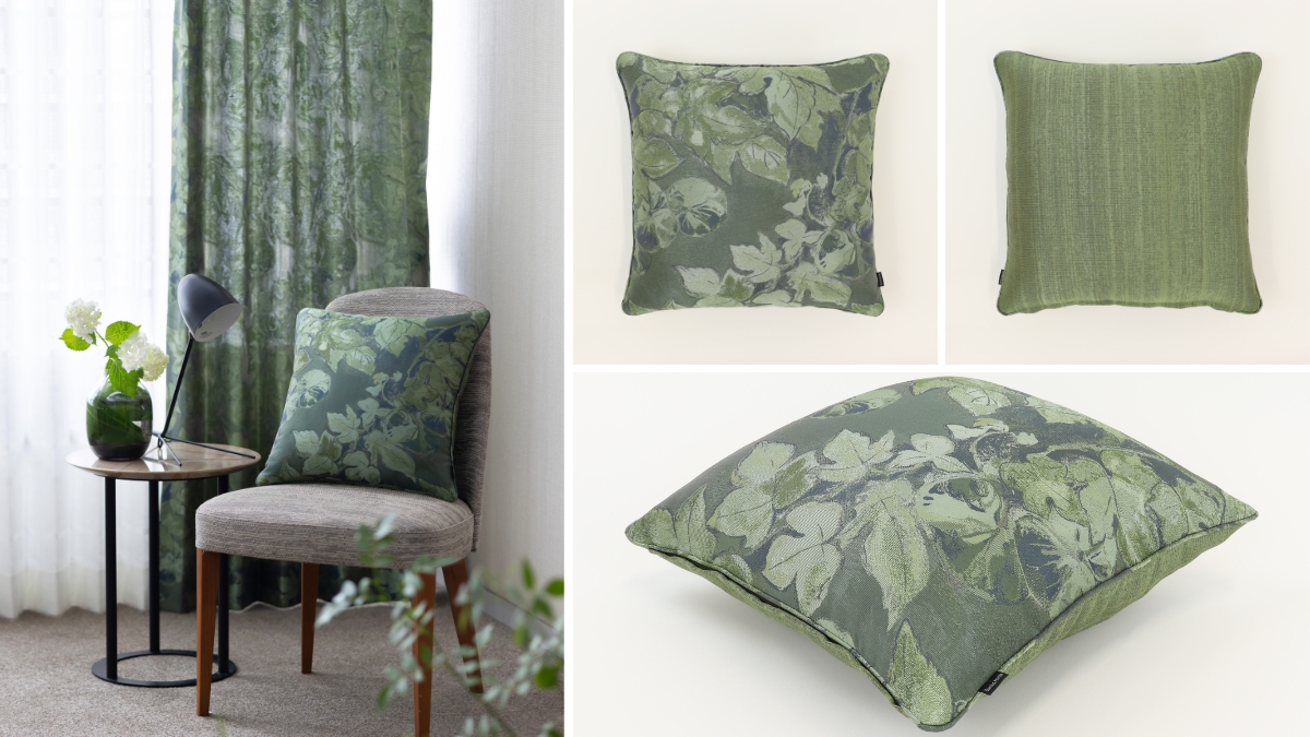 Sumiko Hondaの人気のファブリック「ペルセフォネ」と近年人気急上昇のグリーンが美しい「ビーニャ」がクッションカバーに加わりました。