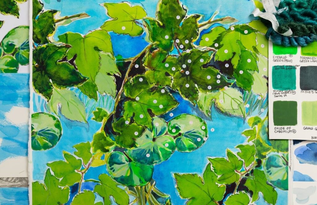 瑞々しい葡萄の葉とつるが幾重にも重なり合う、奥行きのある豊かなデザイン構成です。