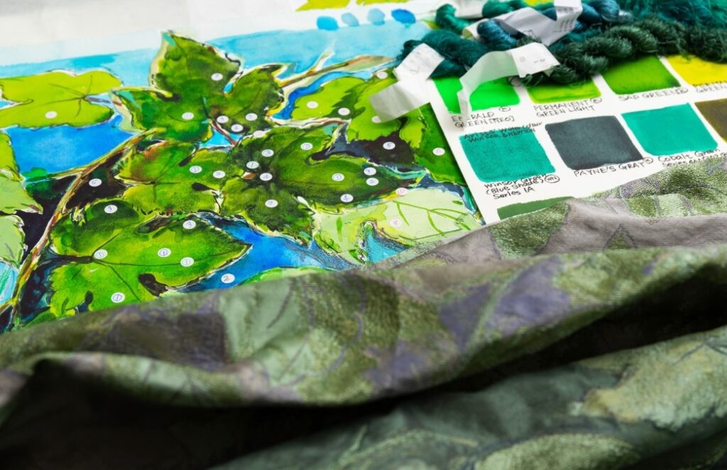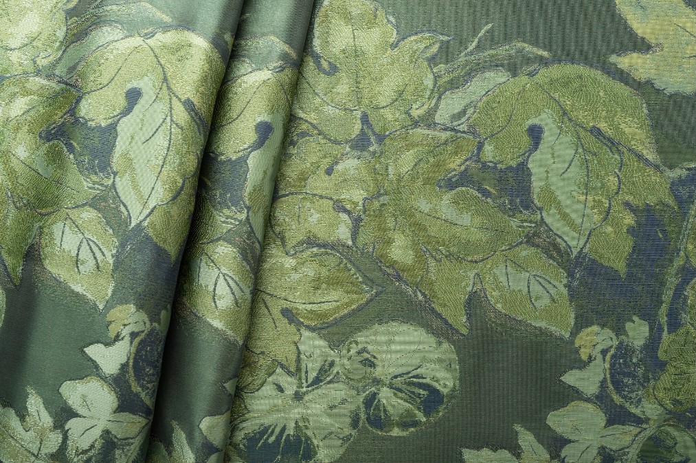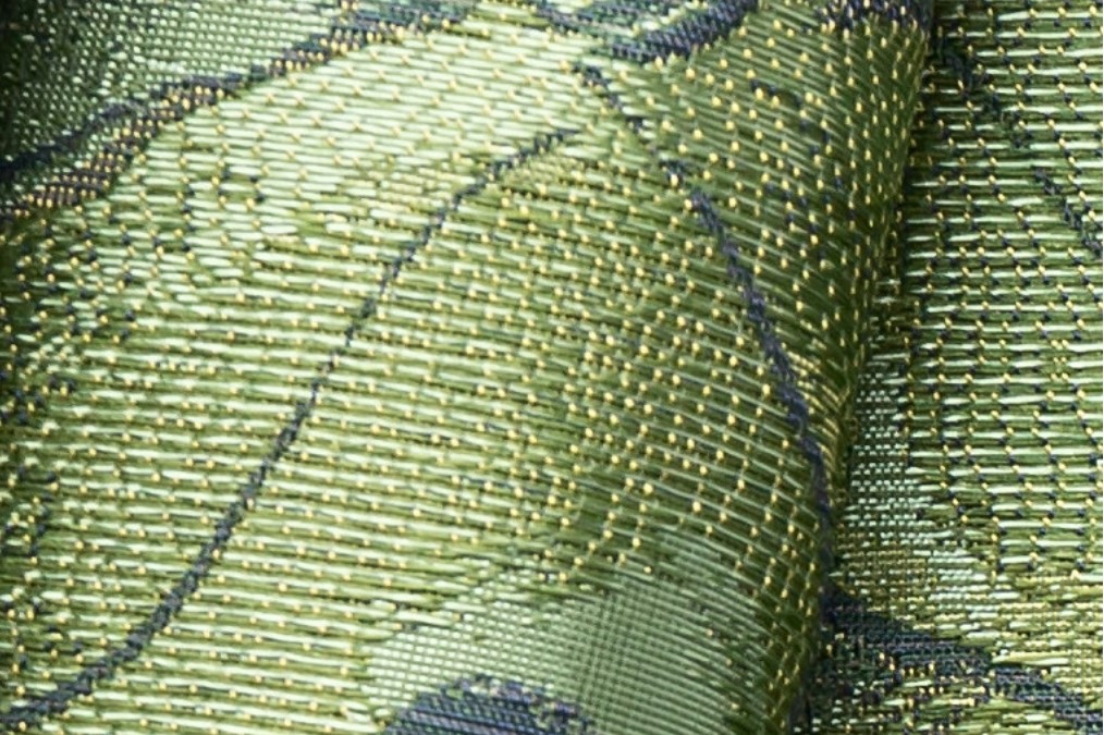 特に葉脈は姿綴じという、デザインに沿ってヨコ糸をタテ糸で綴じる織表現により複雑で繊細な表情が美しく、織技術が際立つ一品です。