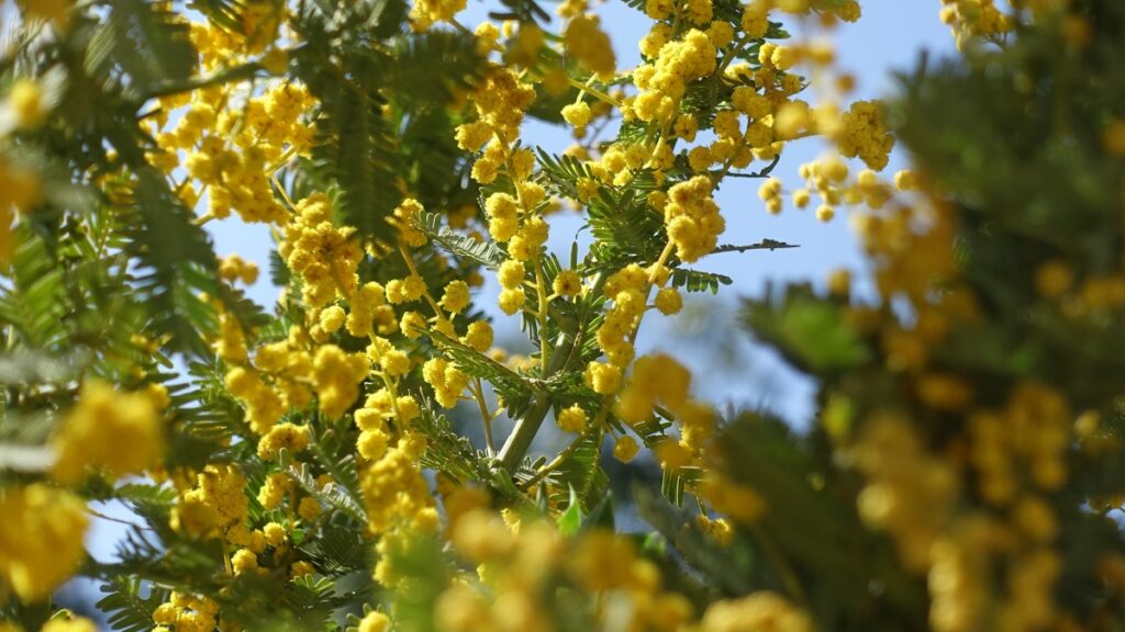 寒い冬を耐え忍んで春の訪れを告げるように黄色の花をつけるミモザの木。