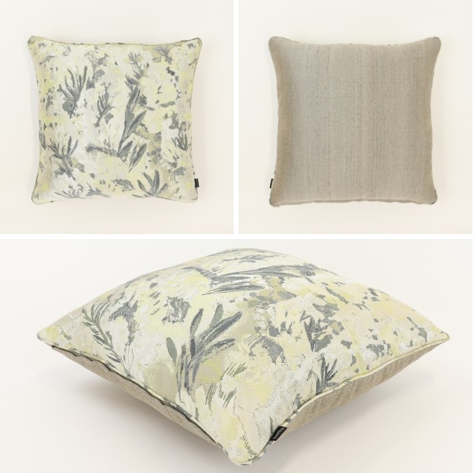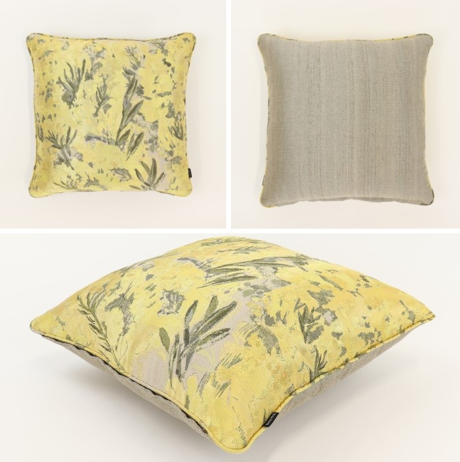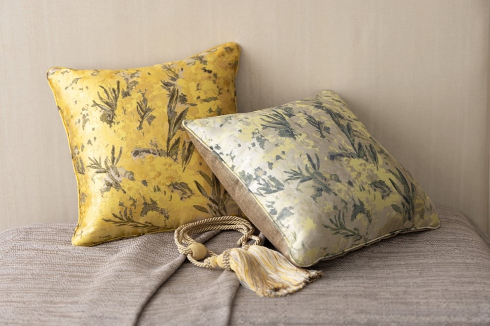 光そそぐなかで鮮やかに咲きこぼれるミモザの希望感あふれるイエロー色のクッション。光によって風通織の緻密に織り上げたミモザの花の粒々と、ふわっとしたふくらみが一層輝き、陽だまりのような温かみをもたらしてくれます。