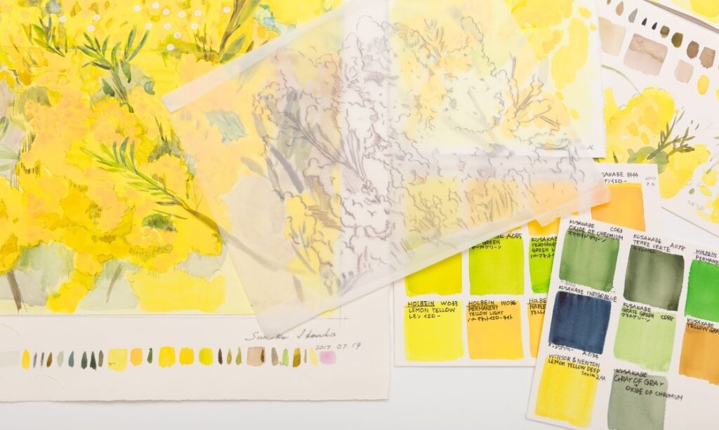 また小さな花が集まり存在感と美しさを増すミモザはこれまでとりあげてきた個々の花の表現とは異なり、