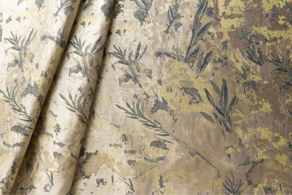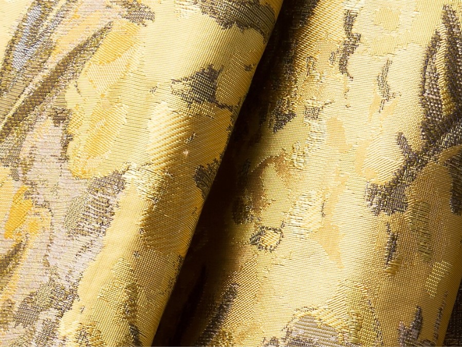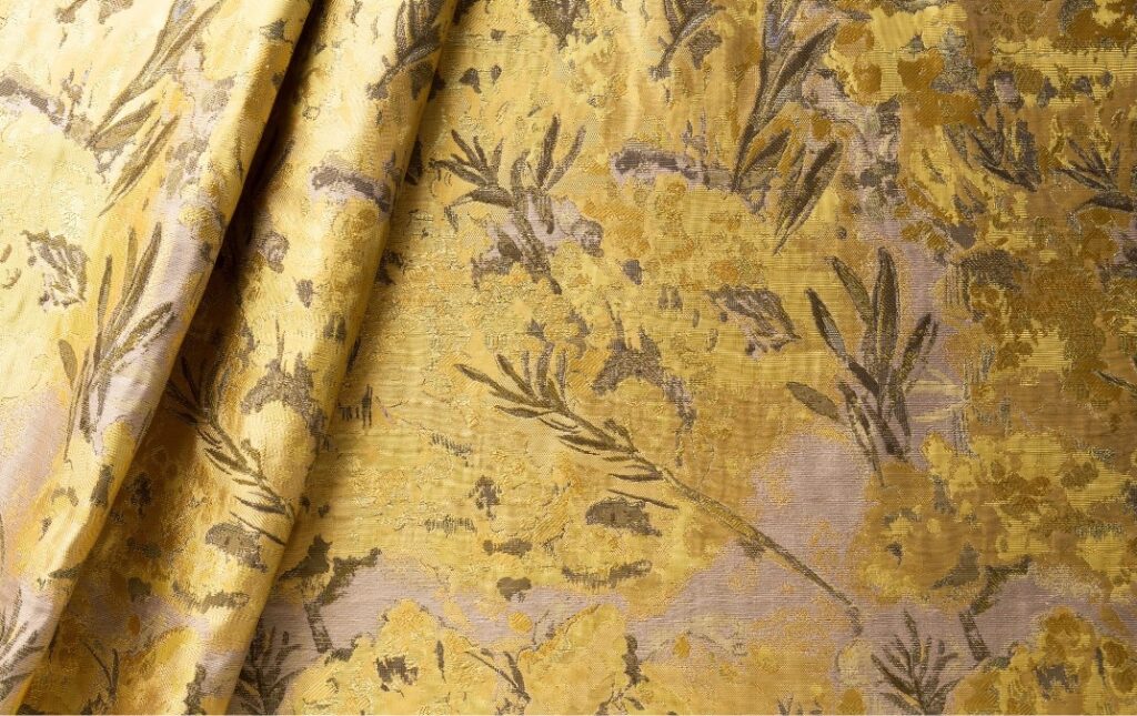 花の集合体を面で表すという新しい試みで織り上げました。幸せを感じる輝く一品。