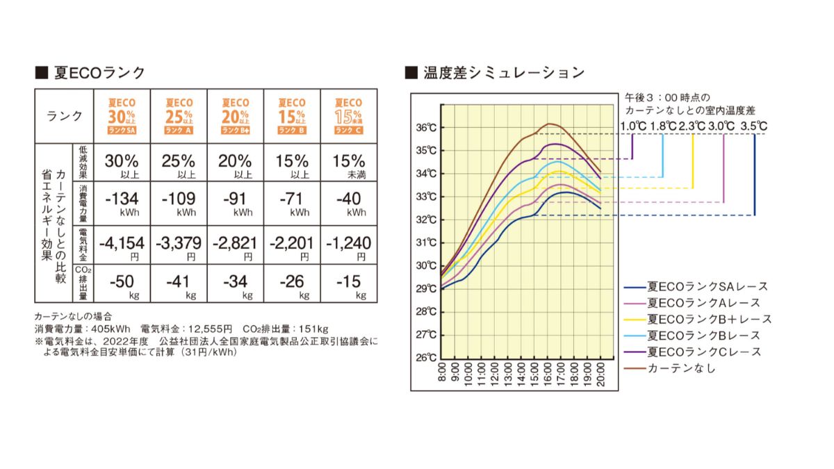 今回ご用意しているラインナップは”夏ECOランク”B+からAの商品で、レースカーテンを設置していない窓に比べて
