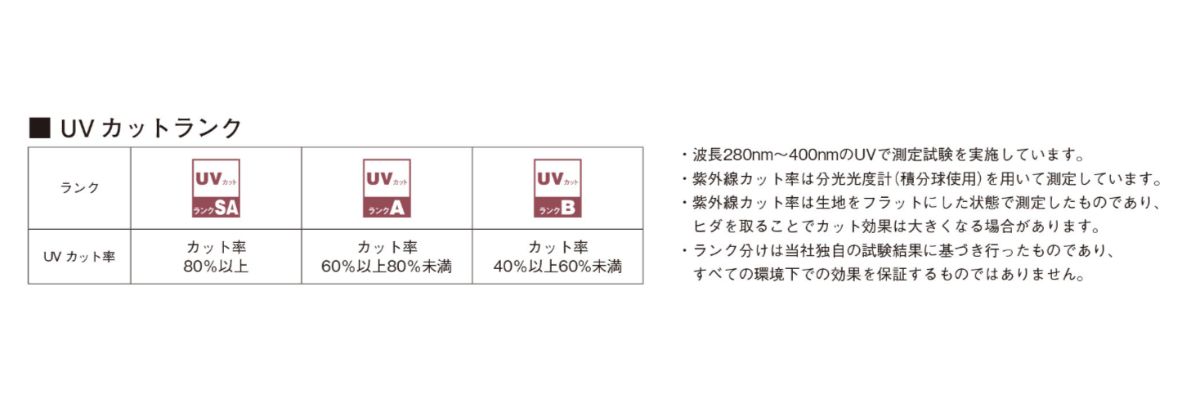 今回のラインナップでは、UVカット率60%以上80%未満のランクAとUVカット率80%以上のランクSAの商品をご紹介しています。
