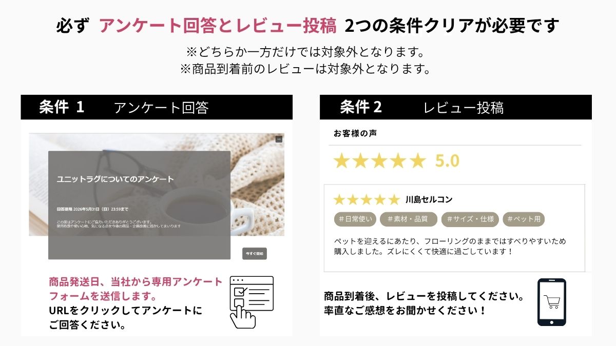 ・対象期間にユニットラグのレビューの投稿とアンケートをご回答いただいたお客様がキャンペーン対象となります。