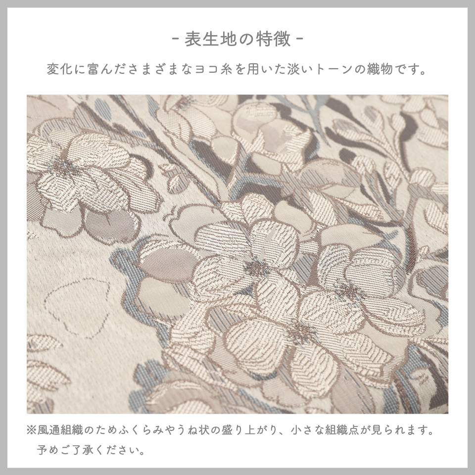 春の訪れを象徴する桜の花のデザインです。揺れ漂う桜の薄い花びらを、変化に富んださまざまなヨコ糸によって織りあらわしました。