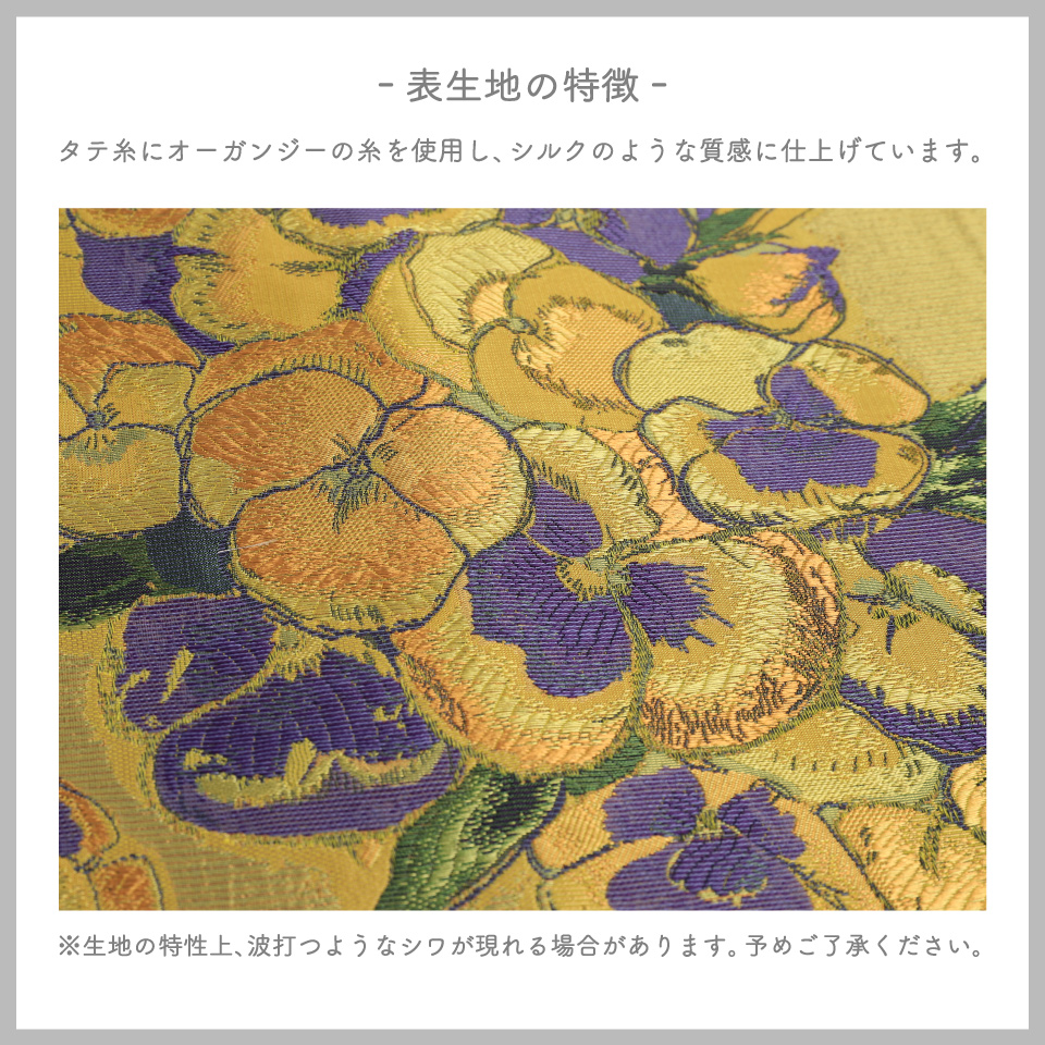 タテ糸にオーガンジーの糸を使うことで、緻密な刺繍調の表現とシルクのような質感に光沢感のある明るいイエローが着姿を華やかに彩ります。