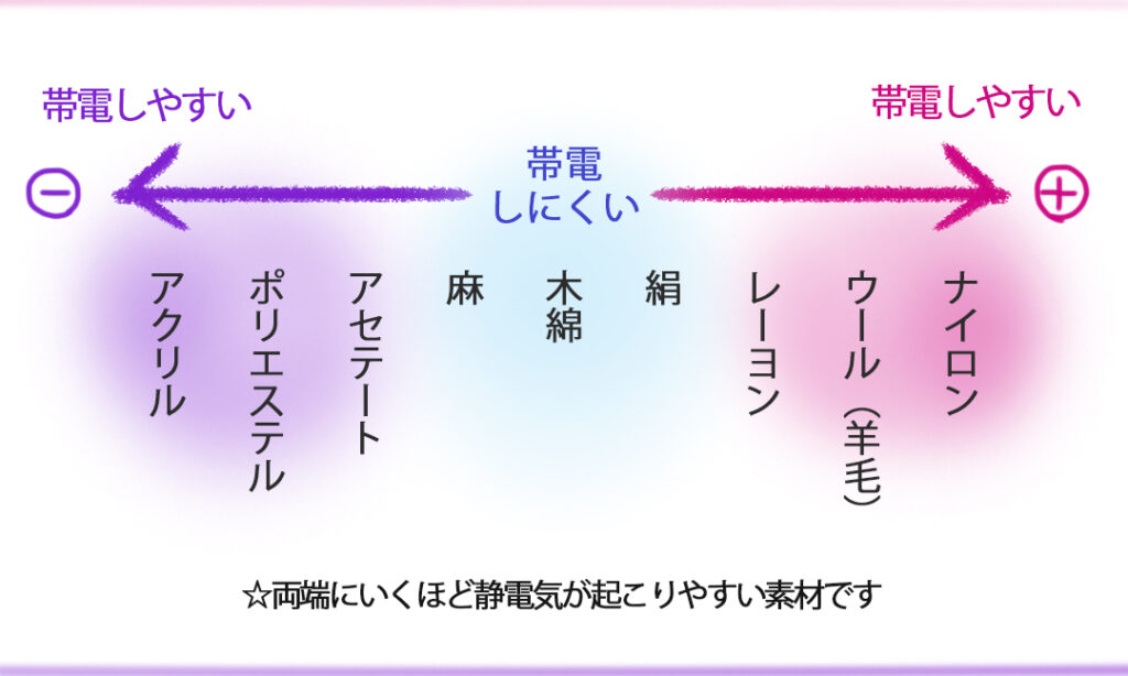 一般的には下記の図のように木綿・麻 → 絹 → ウール → 化繊の順で、静電気が起きやすいと言われています。
