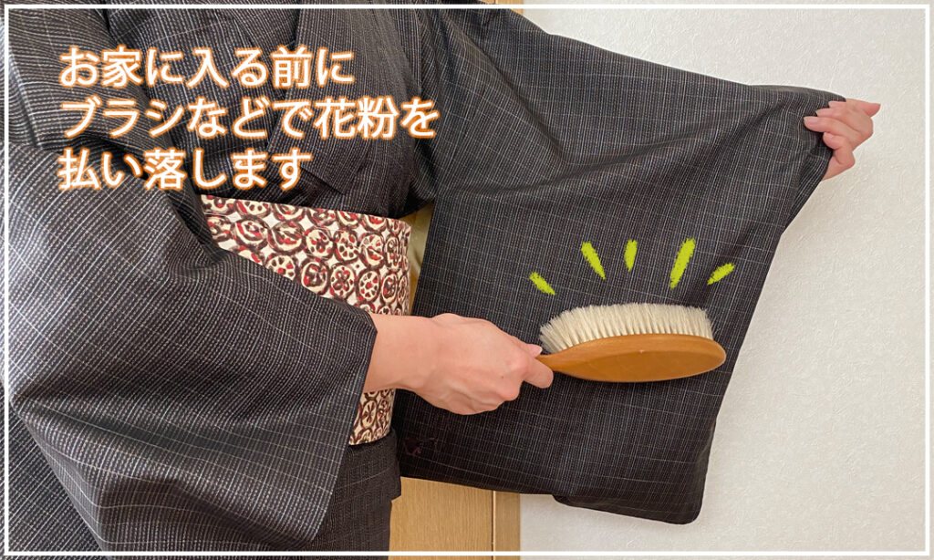 外出後のケアはとても重要です。洋服や和服用のブラシがあれば最適ですが、ない場合はハンカチや手でも上から下に さっと軽く撫で払うだけでもずいぶんと花粉は落とせるようです。